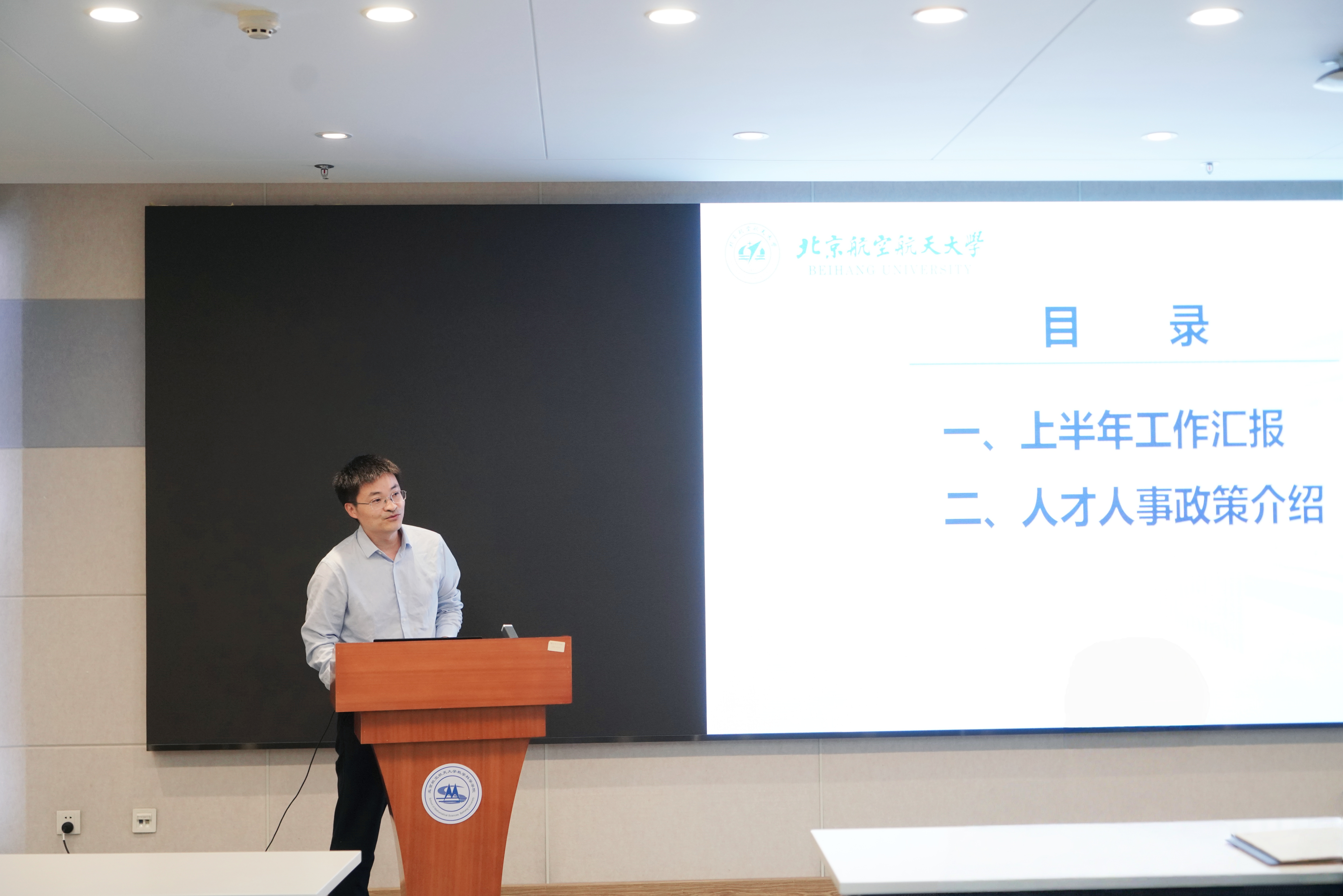 院长助理王振汇报2025年上半年人才人事工作进展,指出我院顺利完成多项人才计划推荐与聘期考核,并详细解读了职称评审、人才引进政策及博士后体系,并鼓励教师积极推荐优秀人才,共同推进学院师资队伍建设。