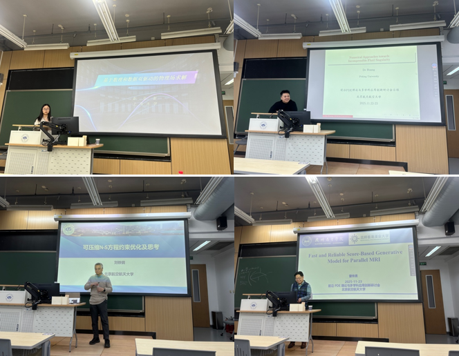本次研讨会邀请了来自多所知名高校的专家进行学术报告。上海大学彭亚新教授系统介绍了物理信息神经网络在PDE求解、多物理场建模及反问题中的最新进展,并剖析了当前面临的挑战。北京大学黄得教授深入阐述了三维Euler方程组有限时间光滑自相似解的爆破理论、数值方法及计算机辅助证明,并详细介绍了流体奇点形成的关键数值方法思想和近期多尺度自相似爆破的数值结果。BBIN宝盈集团刘铁钢教授分享了基于高阶间断伽辽金方法的可压缩气动优化框架,展示了其在翼型减阻与反设计中的高效性能,并探讨了当前可压缩Navier-Stokes优化中存在的关键问题。广州南方学院曾铁勇教授介绍了具有收敛保证的稀疏角CT重建算法、基于深度去噪先验的MRI重建方法及参数更新的去噪融合网络框架。